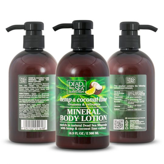 Hemp & Coconut Lime Body Lotion infused with natural minerals from the Dead Sea, softening moisturizers and invigorating Hemp & Coconut Lime Extract, help relax your body and restore your skin’s softness. Our lotion helps to cleanse and refresh your skin. Our Formula is gentle and easily absorbed and will help to seal your body’s moisture, replenish your skin and leave it protected, giving it a fresh and silky feeling for a longer period of time. It is non-oily and suitable for all skin types. For a complete treatment use Hemp & Coconut Lime Body Wash, Hand Wash, Body Oil and more. Bring the treasure of the Dead Sea and modern science into your home.